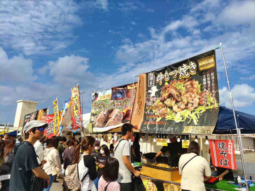 飲食店の屋台で何か食べようと見て廻り、一番並んでる列が少なそうな「博多牛もつ焼き」の店で「焼きそば」を買って食べる事にしました。