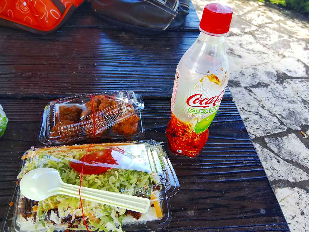 「海中道路」の手前のスーパー「かねひで」でコーラとホットドックを買い、「キングタコス」で「野菜チーズタコライス」と「ナゲット」を買って行きました。