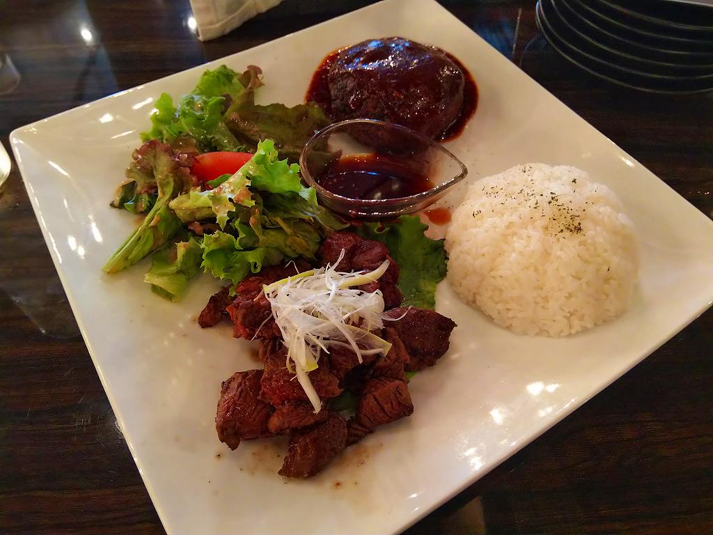 私は「牛肉ニンニクポン酢&ハンバーグデミソース」で、うちのおくさんは「白身魚香草パン粉焼き&エビチリ」を頼みました。