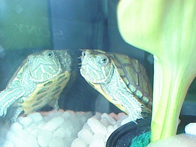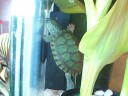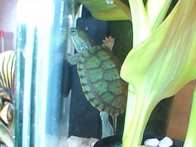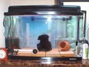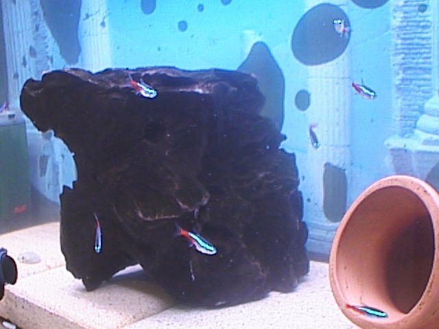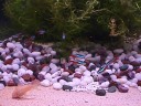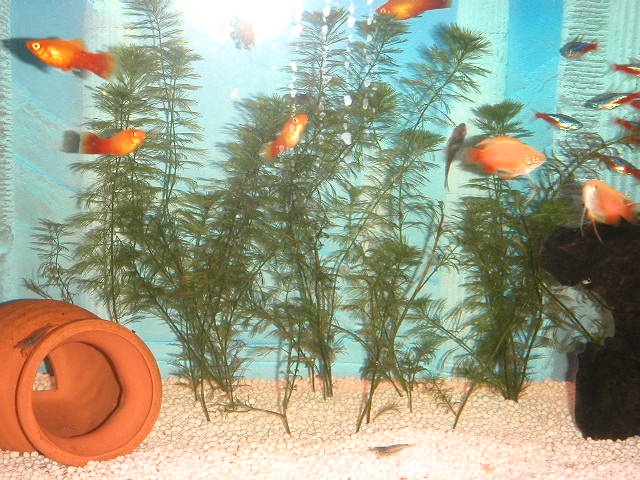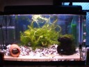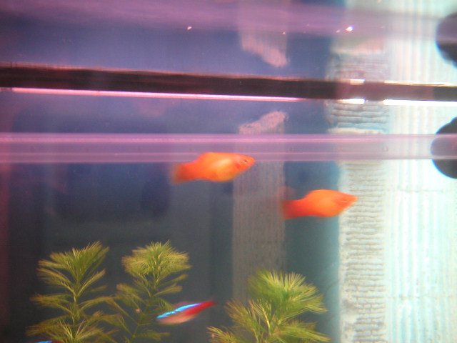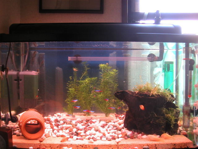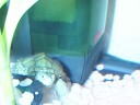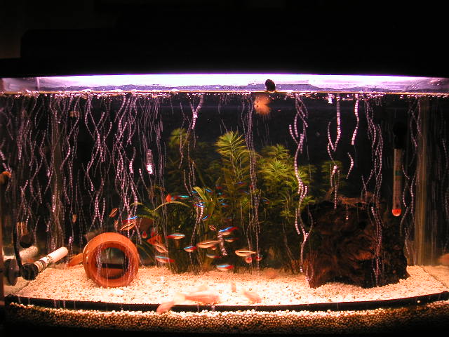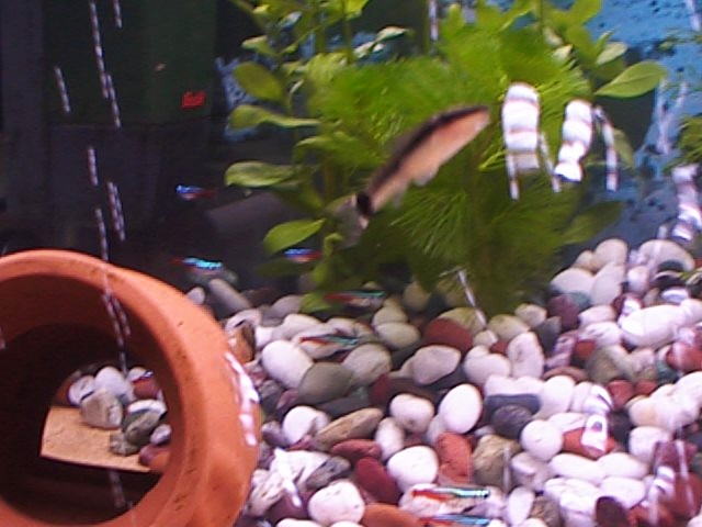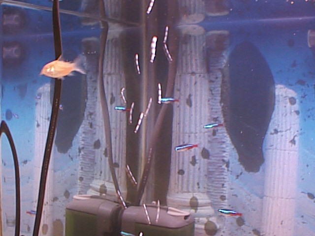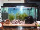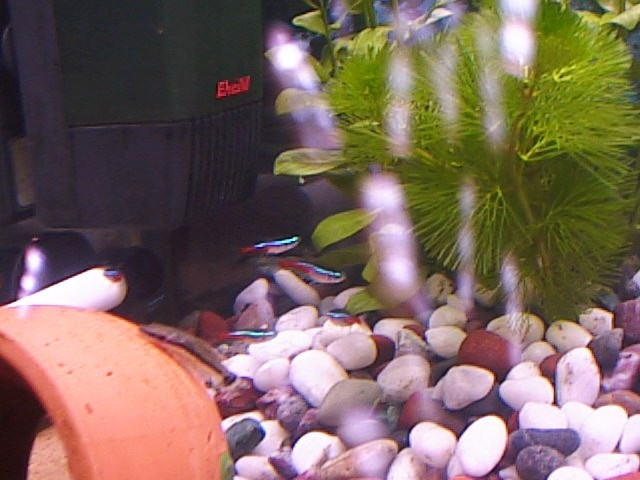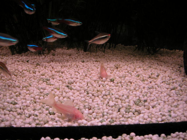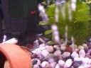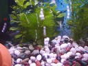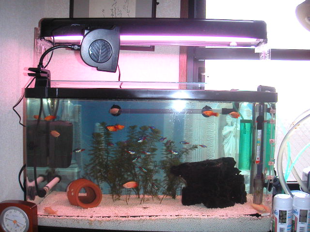 2003年1月5日現在の我家の水槽の住人達です。10月に産卵したコリドラスの稚魚達は、頭から尻尾までが1cm位に達した時に、もうそろそろ大丈夫かな〜と思い放流して見たところ、あっと言う間に食べられてしまったのですが、その中でも一生懸命、酸素用のホースの隙間に隠れたりして何とか7匹が無事大きくなりました。今では、ネオンテトラよりも大きくなりました。それと、前回網ですくってネットに入れてた稚魚もすっかり大きくなったのですが、グラミーでは無くプラティでした。こちらも今では立派な物です。餌を与え過ぎているのか、どの魚もお腹がかなり膨らんでいて、先日ネオンテトラとブラックネオンを追加したのですが、こちらもあっと言う間に皆お腹が出て来てしまいました。おかげで糞の量が多くてコケがついて来た為、又石巻貝を10匹追加してしまいました。(これじゃ、悪循環ですよね〜!ははは・・・)