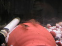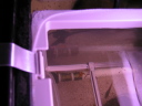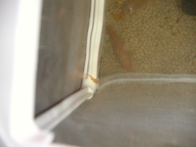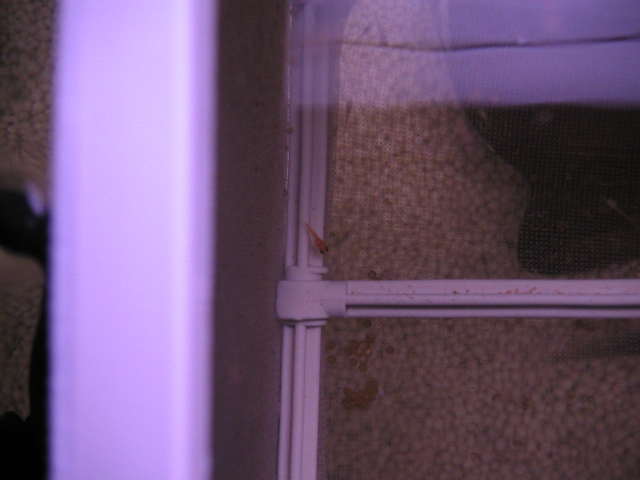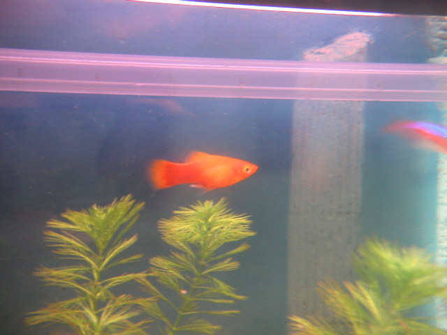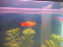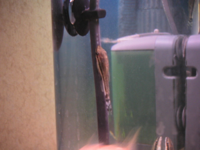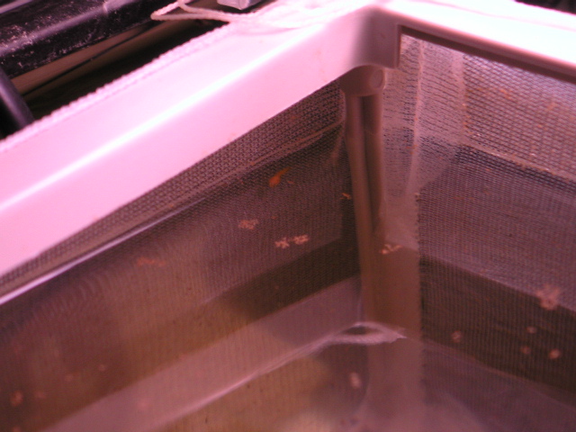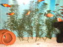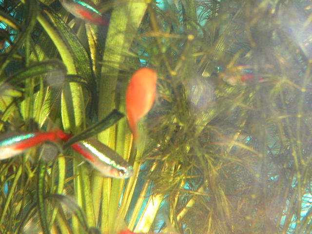 2002年10月15日に無数の卵をコリドラスが産卵したのを発見し、すぐに卵を稚魚用ネットに移しました。それから3日後の18日に初めてコリドラスの稚魚が誕生しました。約15匹〜20匹位のおたまじゃくしみたいな白い稚魚達がネットの下の方に沈殿しています。(写真では良く探さないと、ほとんど見えないと思いますが!)その後19日になって稚魚用の餌を買って帰って来ると、メインの水槽の中をオレンジ色の稚魚が泳いでいるのを発見!プラティに追っかけまわされていました。それを網ですくってネット内に入れ、救助完了しました。まだよく解らないんですが、色・形からして、グラミーの稚魚ではないかと思います。(もし、そうだったら嬉しい〜!)たぶん、他にもたくさん生まれて、一匹だけ生き残ったのではないかと思いますが、良くガンバって生き延びたな〜と可愛くなり、つい写真を撮ってしまいました。今後の成長をご期待下さい!