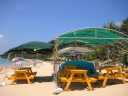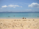 伊計島の伊計ビーチを過ぎて畑の中の標識を見ながら、「まだ先に行くの」と思う位に進むと出て来る大泊ビーチです。さすがに伊計島まで行くと海はかなり綺麗です。おまけに混んで無いので、ゆったりと過ごせます。砂もさらさらで気持ち良かったし!