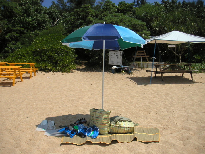 お金を使わない娯楽を目指しているので、ビーチパラソルから全部自前で持参してきました。でも、安いですよー!ビーチパラソルは480円でゴザは100円で購入したので、この日1日でレンタルしたと思えば、もう元が取れました。