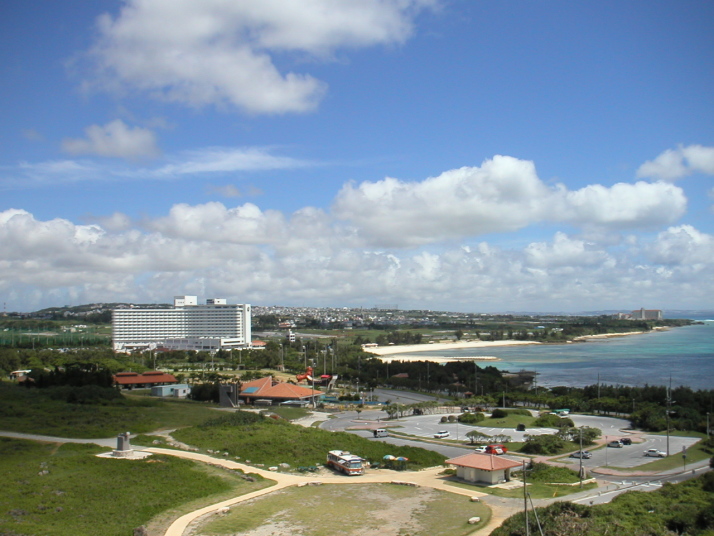 本島中部辺りにある残波岬です。ここ良いですよ〜!眺めが!でも暑いんですけどね。岬の先端に灯台が有るんですけど、この上からの眺めが最高です。ちなみに入場料が大人150円、子供20円かかります。(なんで、子供は20円なの?)この日は麦藁帽子をかぶって昇った為、飛ばないように帽子を押さえながら、写真を撮りました。下を観ると結構怖いかも! |